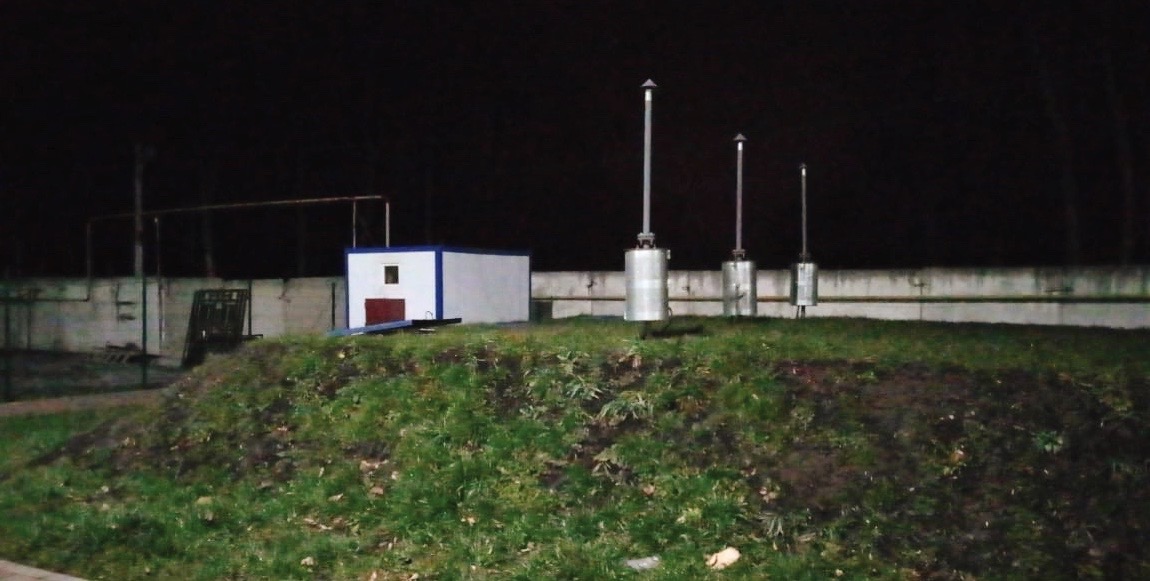 • канализационная насосная станция с 3 погружными насосами (Насосная станция выполнена в виде вертикальной емкости с нижней частью, выполняющей функции приемного резервуара, в котором расположены погружные канализационные насосы со встроенными поплавковыми выключателями. На вводе сточных вод предусмотрен решетчатый контейнер для задержания крупных включений, поднимаемый на поверхность по направляющим. В перекрытии расположен люк для доступа в приемный резервуар, оснащенный лестницей.).