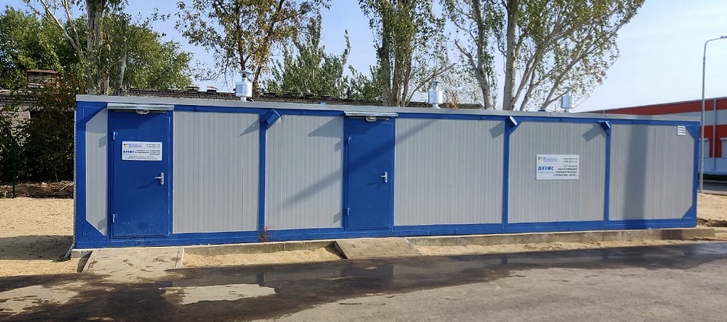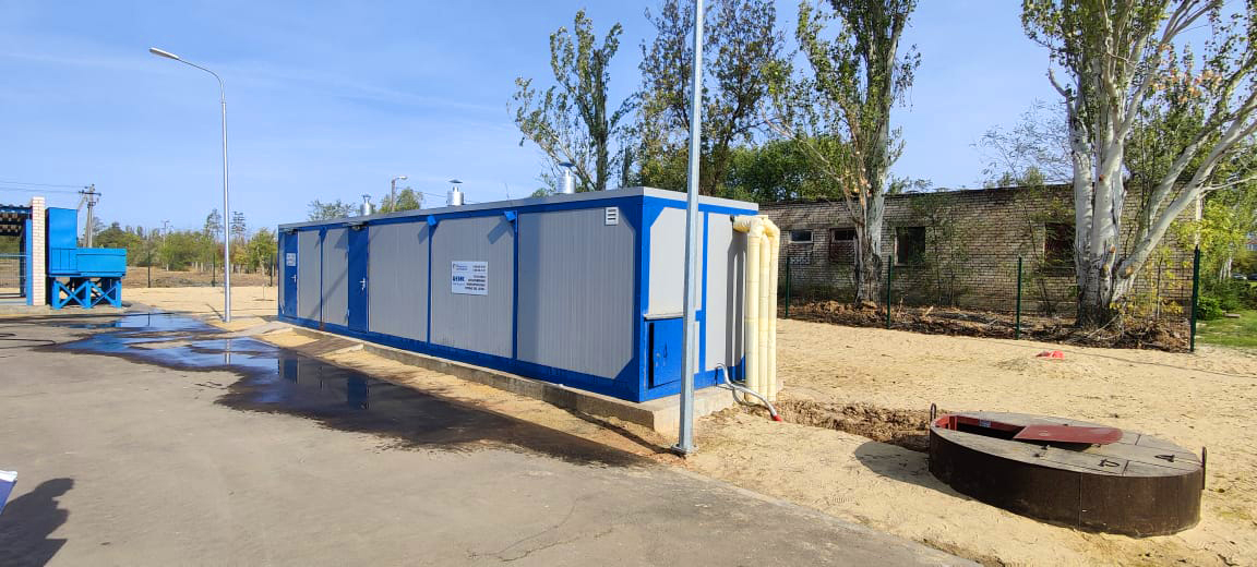 • оборудование в блок-контейнере: насосы-дозаторы, контактные резервуары (Контактные резервуары выполнены в виде горизонтальных цилиндрических резервуаров с подводящими и отводящими трубопроводами сточных вод, подводящими трубопроводами раствора дезинфектанта и воздуха, оборудованы системой барботажных трубопроводов, сорбционными фильтрами для очистки отработанного воздуха и сигнальными поплавковыми выключателями.),  компрессоры, шкаф управления, система автоматизации работы установки.