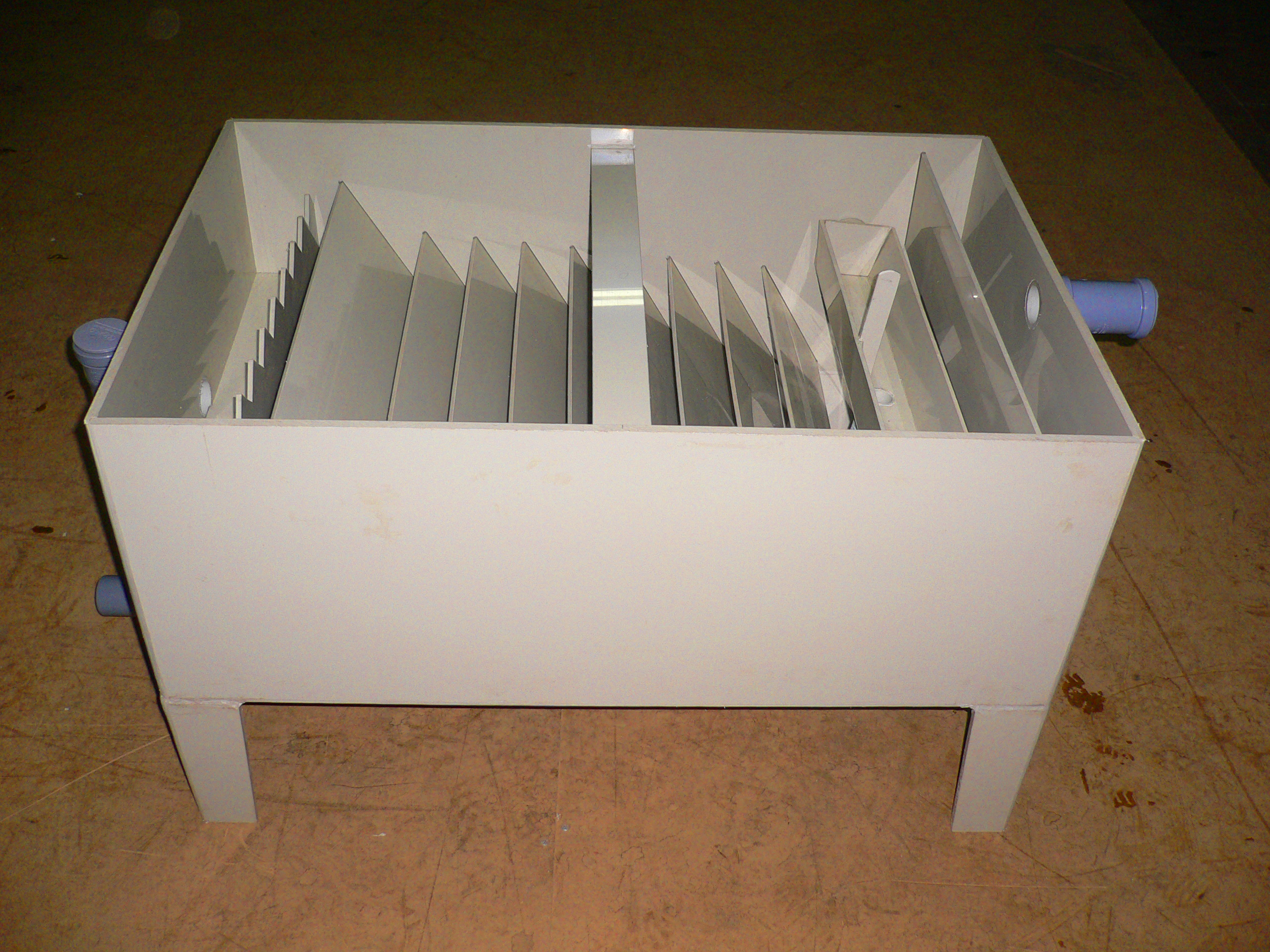 Станция очистки имеет люк, герметично закрывающийся во избежание проникновения неприятных запахов из резервуара. Конструкция состоит из следующих компонентов: резервуар, подводящий и отводящий патрубки, колодец превышения, стояк для удаления осадка, вентиляционная труба, сигнализатор уровня жира.